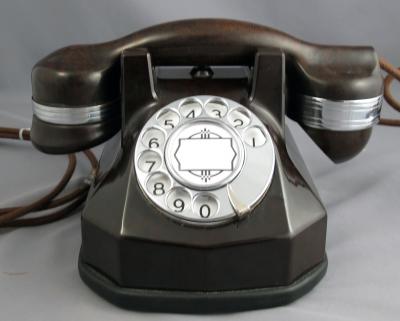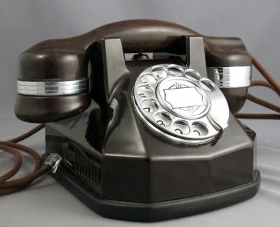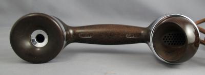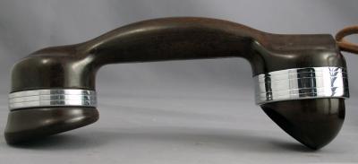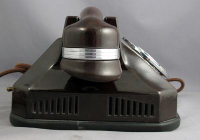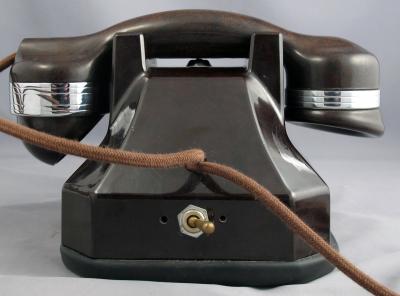 This Automatic Electric Type 34 Monophone was the first integrated deskset from Automatic Electric. It was manufactured from 1934-1938 and is great example of art deco design. The body on this phone is in remarkable condition and has no cracks or breaks. The brown bakelite still has a beautiful sheen that reminds of an era of quality long since past. The most striking thing about this phone is its Chrome trim. The fingerwheel looks brand new and will definitely attract attention. The receiver also has the full chrome trim and look at the receiver cap. The trim on the inside is impeccable, you don't see that very often.