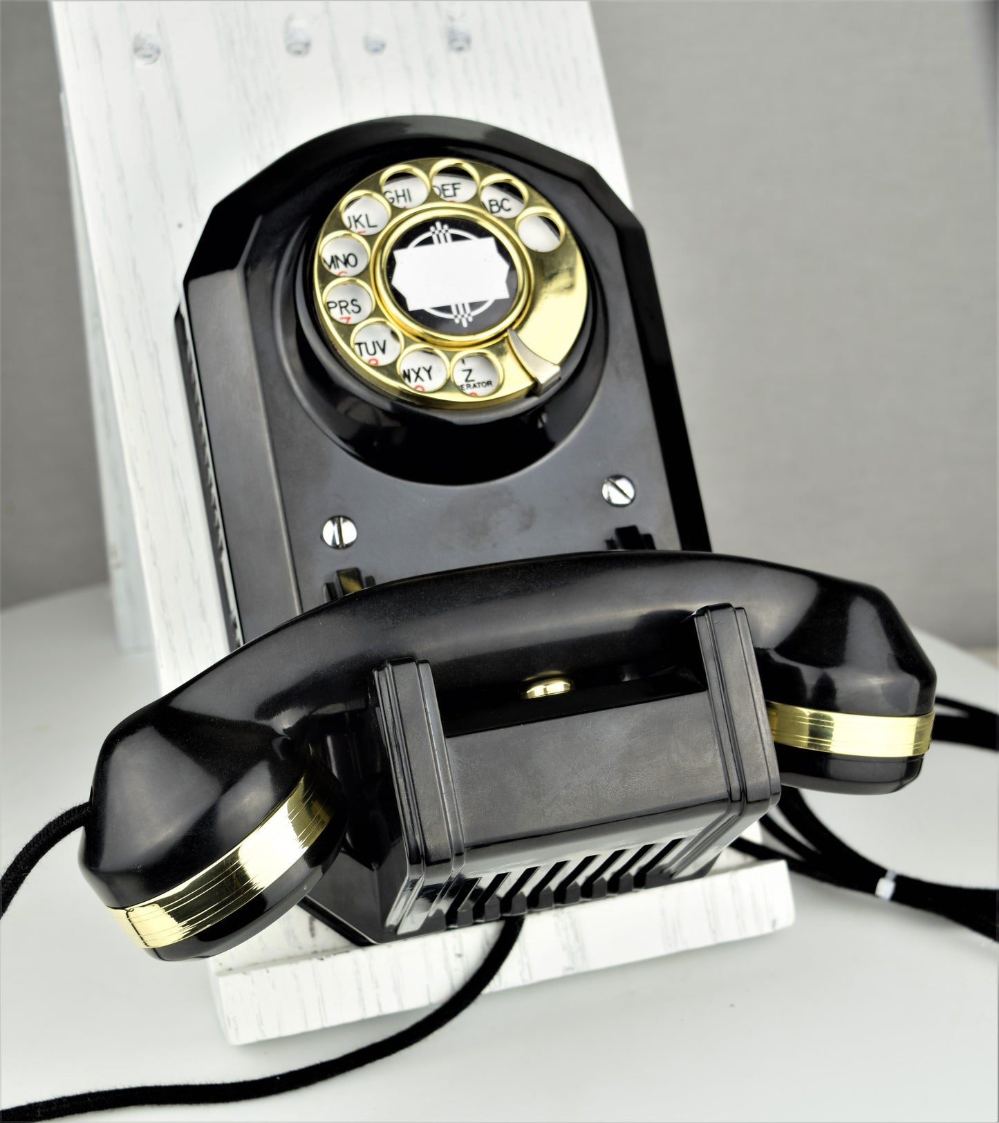 Handset – Handset has been ultrasonically cleaned to get all embedded debris out. It is then sanded through a 4 step process (400, 800, 1000, 2000 grit) and buffed back to its beautiful original shine. We then trim the handset with brass handset rings to complete the look.