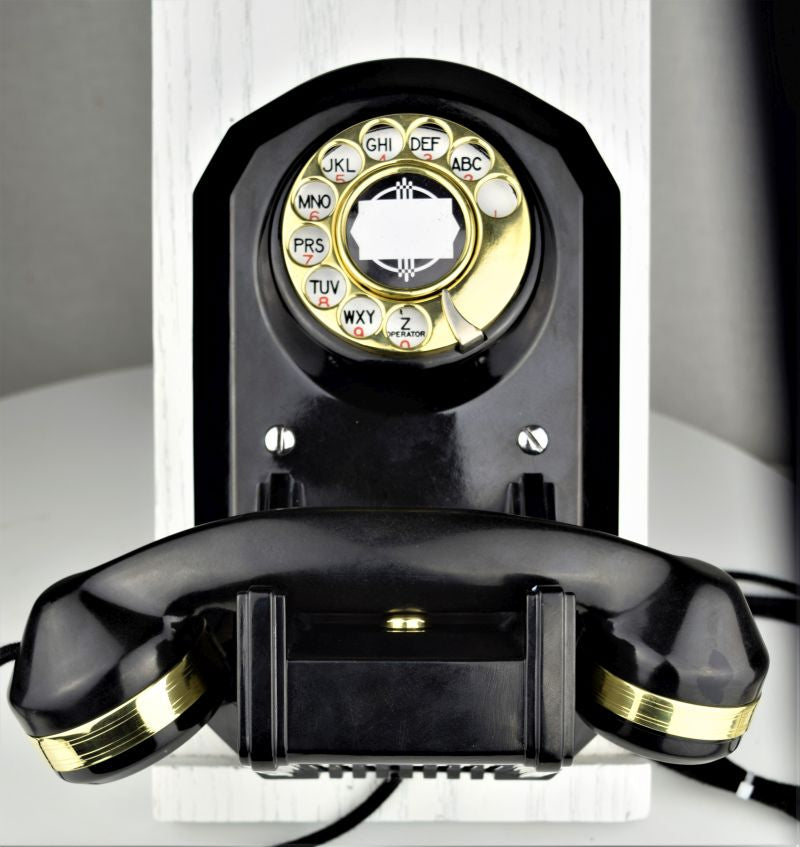 The Automatic Electric Type 50 Wall phone was introduced in 1938. This combined phone includes all the components required to operate within the casing, eliminating the need for an external network subset and ringer. Like it's cousin the Type 40 desk phone, the Type 50 is a graceful example of art deco design. These rugged phones were made of solid Bakelite and engineered to last a lifetime. The body of the phone measures 9.5" high by 5.75" wide. The cradle comes out 5.5" from the rear. The handset is 9" wide. A modern line cord has be added to this unit for your convenience.