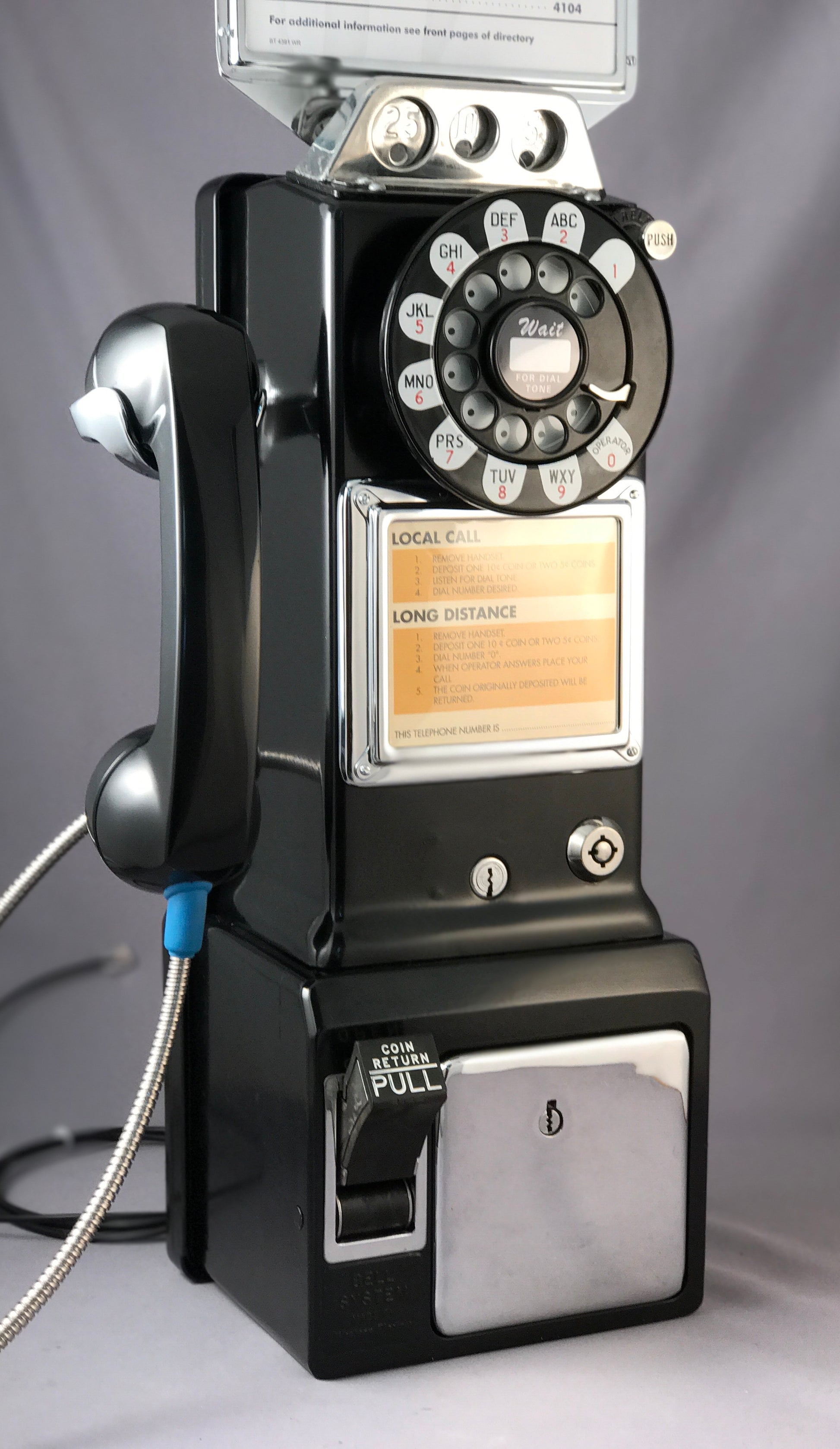 Cords – The phone has been outfitted with a brand new vinyl or optional chrome armored handset cord and a vinyl line cord. The line cord has a modular connection to facilitate a modern connection to your wall jack.