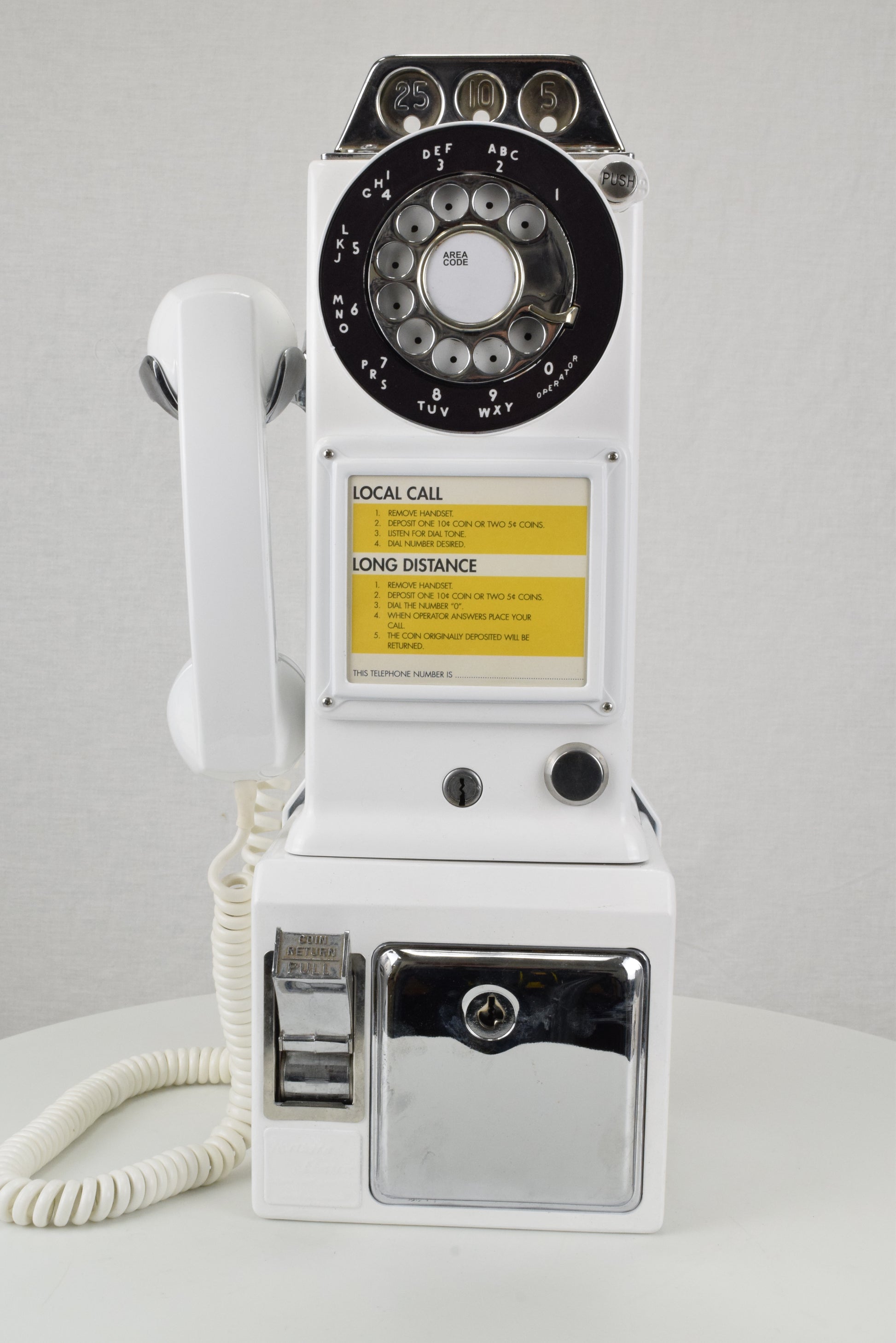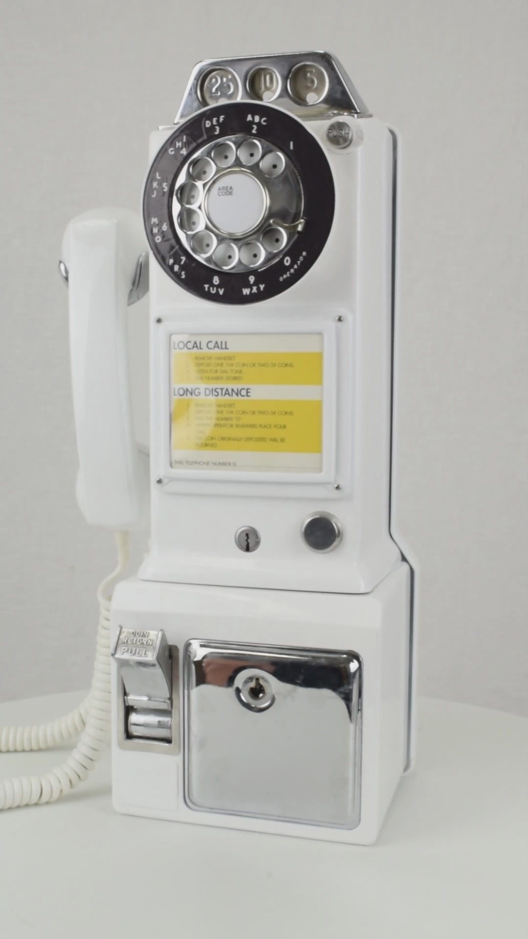 Here is a vintage working 1950s Model 233 3 slot payphone. The internal parts of this phone are all present and intact, and it has been wired with a modular line cord so that it will work on your home phone line. We can also install a ringer to notify you of incoming calls. Although you won't need a coin to make a call with this classic, the phone still emits the telltale "ding" as a coin is dropped. We are including the the keys to the coin vault and the top housing. Please note, the phone does not come with a coin box. Perfect for billiards rooms, game rooms, Pool side, family rooms or anywhere else. Your antique payphone will look great! This is a unique opportunity to own a classic piece of functional communications technology.