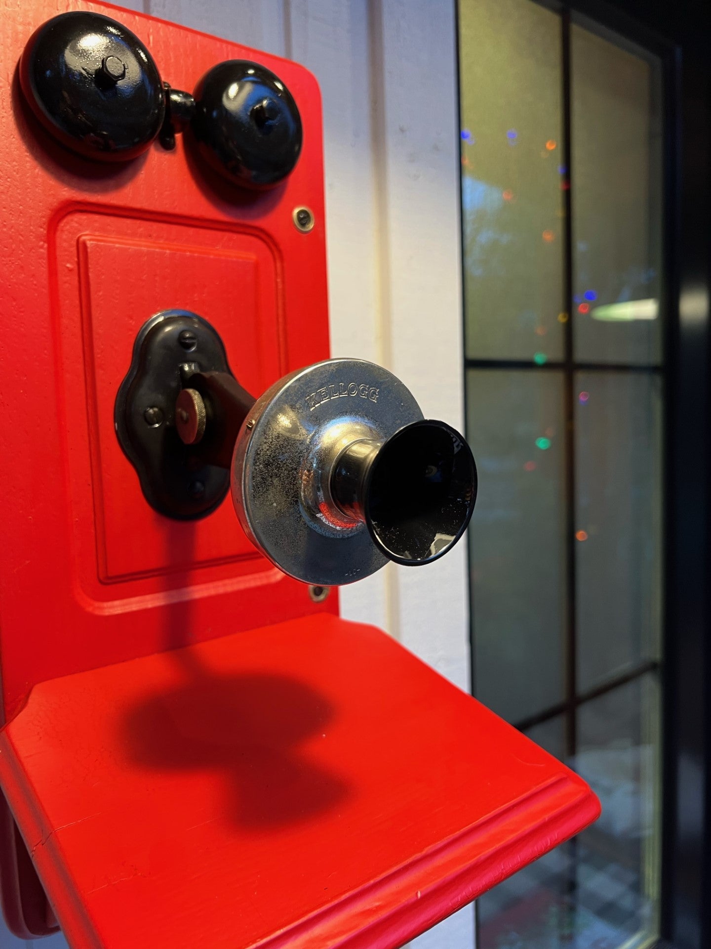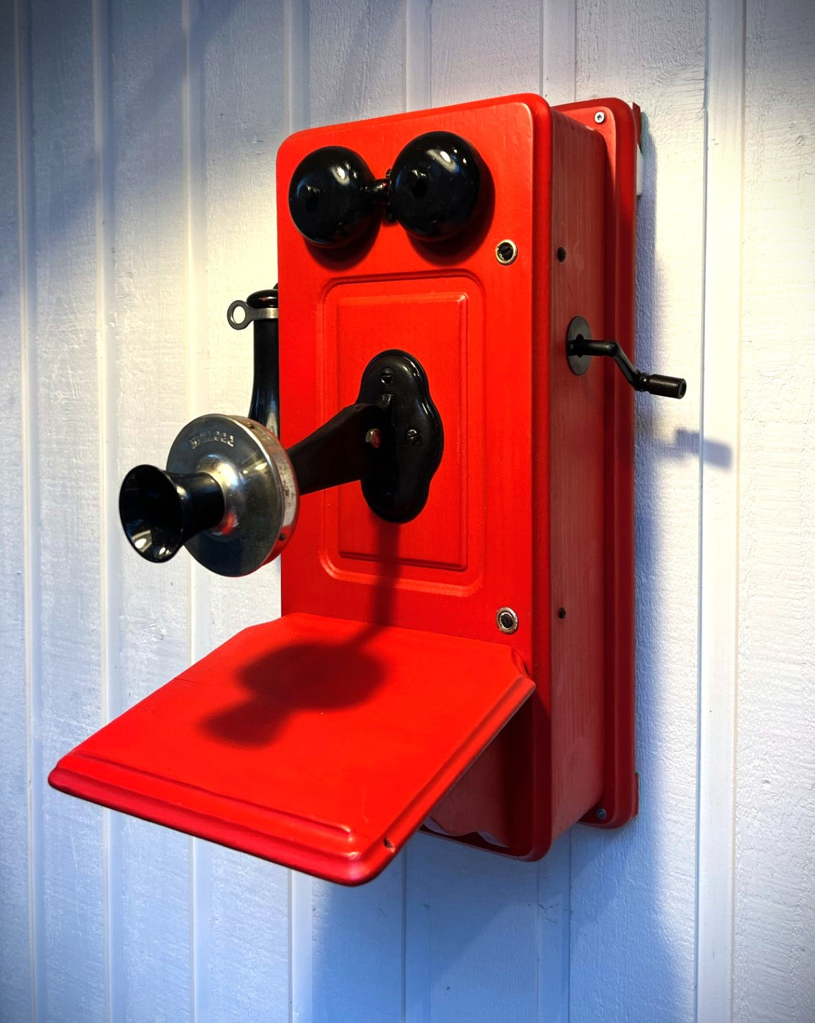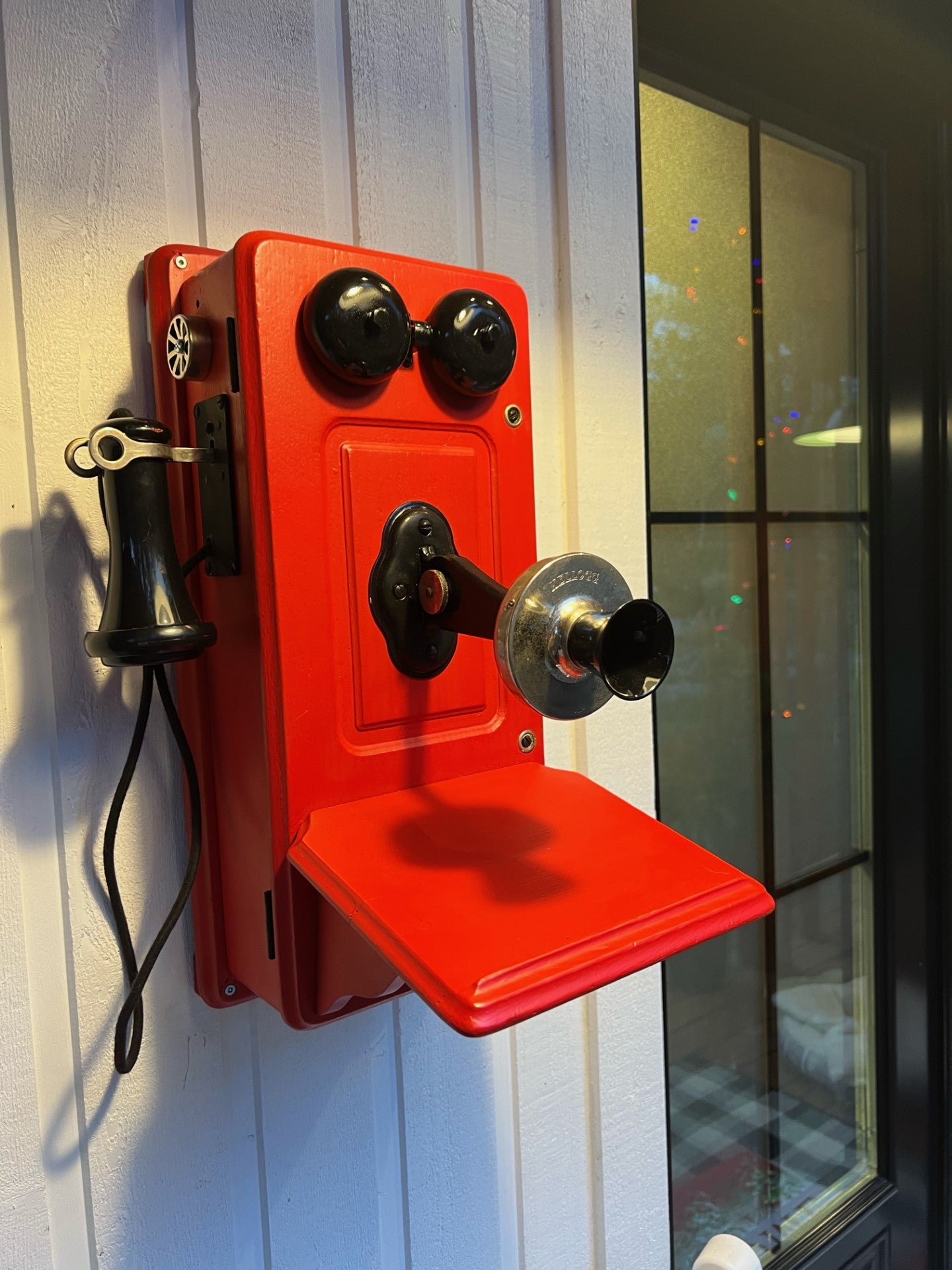 Imagine the visual impact this captivating wall phone will have as it hangs on your wall, telling stories of a bygone era. Meticulously refinished in a striking red hue, its satin finish radiates elegance and sophistication. The wood's natural grain subtly peeks beneath the vibrant shade, adding depth and character to this unique piece.