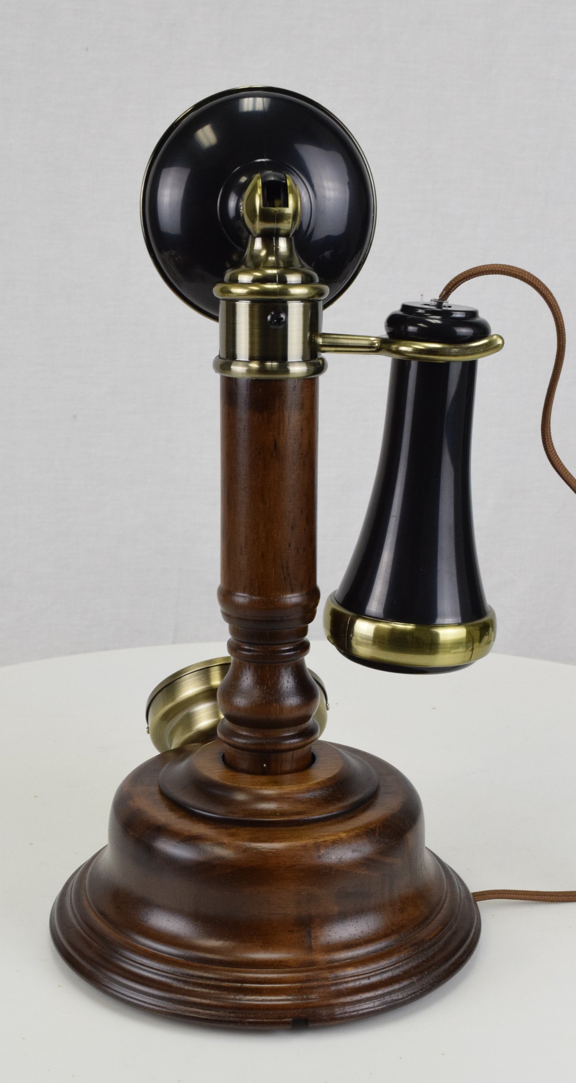 Introducing our exquisite Reproduction Candlestick Style Telephone, inspired by the majestic elegance of a wooden Roman column. This timeless piece combines classic charm with modern convenience. Featuring push button dialing and a last number redial function, it effortlessly blends the luxurious past with the functionality of the present. The electronic ringer can be adjusted to high, low, or completely turned off, allowing you to tailor your phone experience to your surroundings. With the receiver high or low volume settings, your conversations will be crystal clear. Elevate your décor with this beautifully crafted telephone, a stunning fusion of history and innovation.