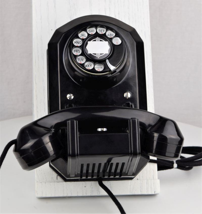 The Automatic Electric Type 50 Wall phone was introduced in 1938. This combined phone includes all the components required to operate within the casing, eliminating the need for an external network subset and ringer. Like it's cousin the Type 40 desk phone, the Type 50 is a graceful example of art deco design. These rugged phones were made of solid Bakelite and engineered to last a lifetime. The body of the phone measures 9.5" high by 5.75" wide. The cradle comes out 5.5" from the rear. The handset is 9" wide. A modern line cord has be added to this unit for your convenience.