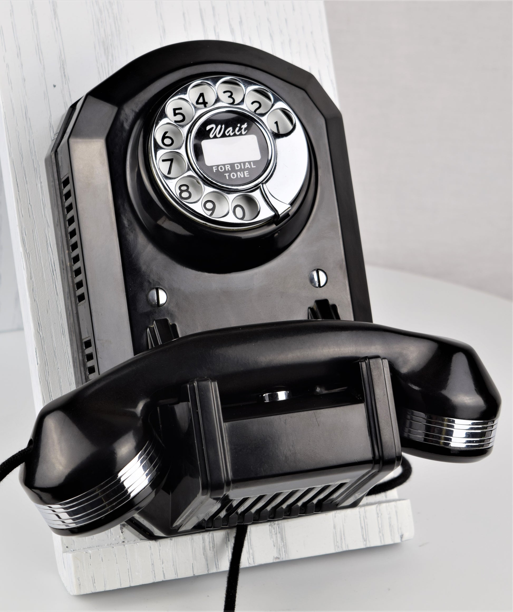 The Automatic Electric Type 50 Wall phone was introduced in 1938. This combined phone includes all the components required to operate within the casing, eliminating the need for an external network subset and ringer. Like it's cousin the Type 40 desk phone, the Type 50 is a graceful example of art deco design. These rugged phones were made of solid Bakelite and engineered to last a lifetime. The body of the phone measures 9.5" high by 5.75" wide. The cradle comes out 5.5" from the rear. The handset is 9" wide. A modern line cord has be added to this unit for your convenience.