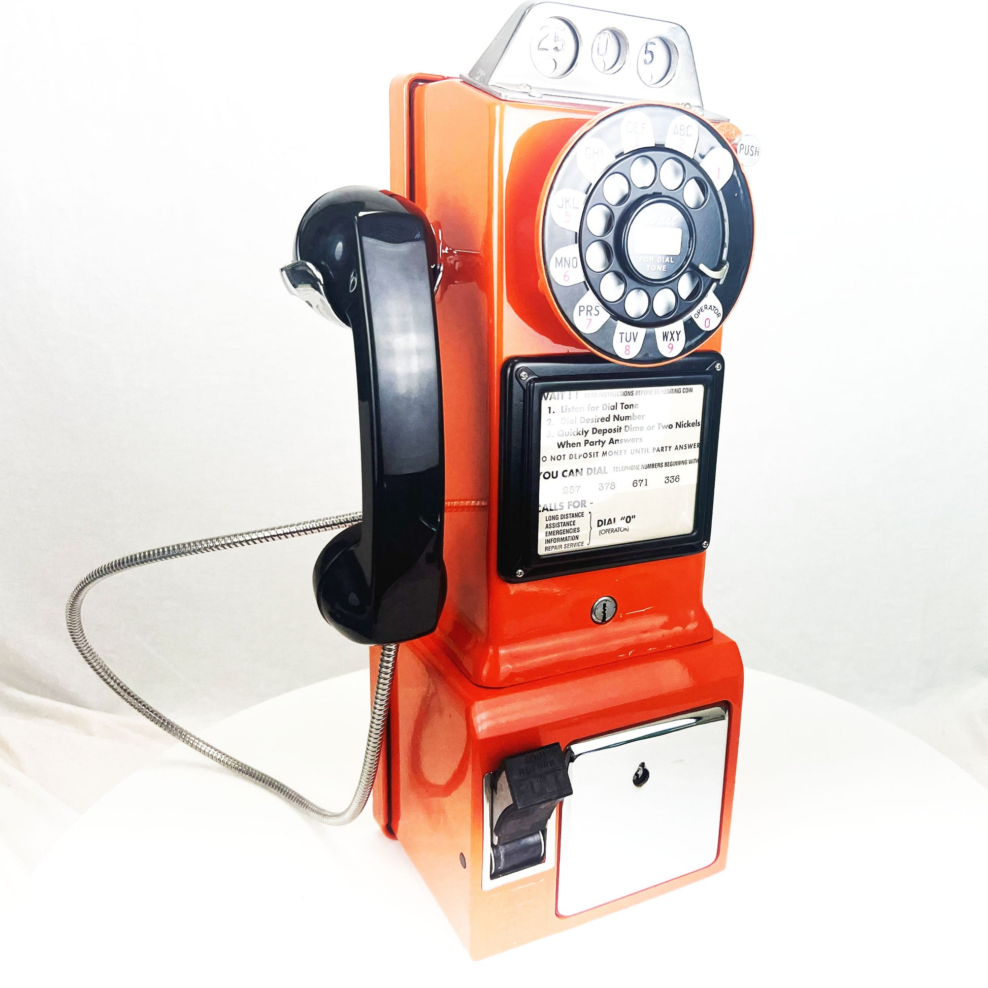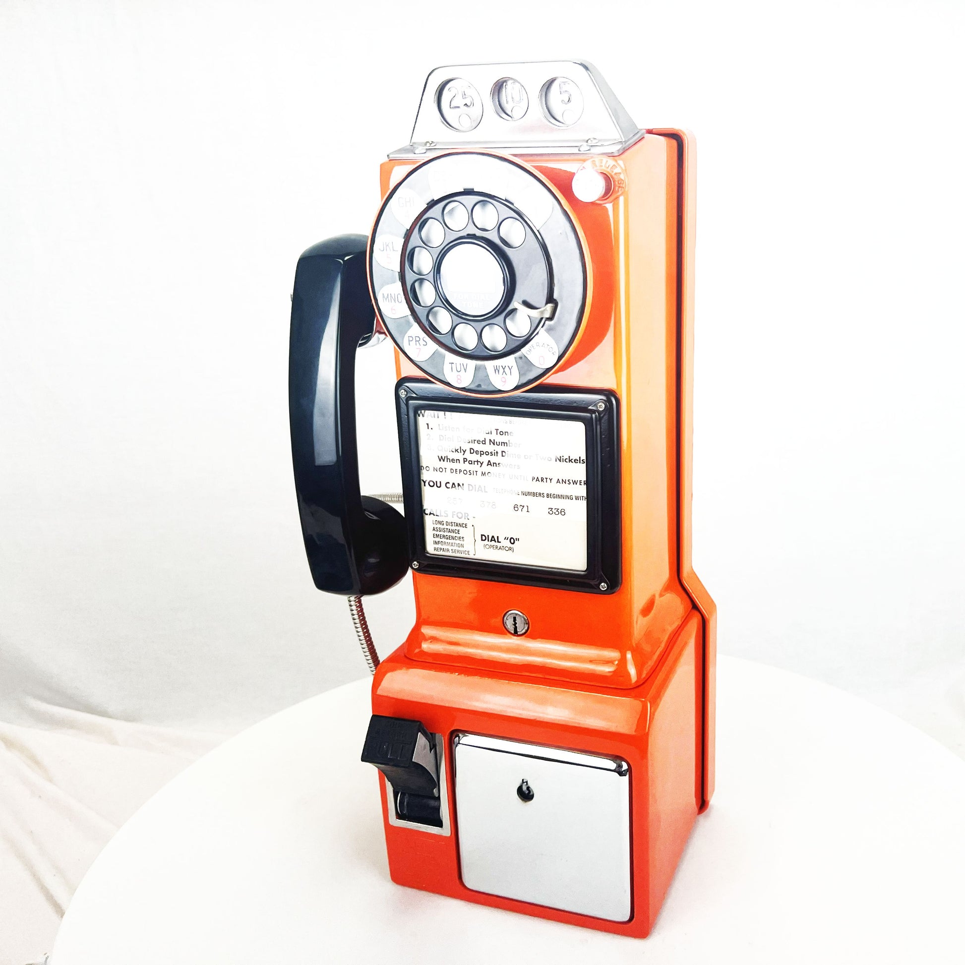 Here is a vintage working 1950s Model 233 3 slot payphone. The internal parts of this phone are all present and intact, and it has been wired with a modular line cord so that it will work on your home phone line. We can also install a ringer to notify you of incoming calls. Although you won't need a coin to make a call with this classic, the phone still emits the telltale "ding" as a coin is dropped. We are including the the keys to the coin vault and the top housing. Please note, the phone does not come with a coin box. Perfect for billiards rooms, game rooms, Pool side, family rooms or anywhere else. Your antique payphone will look great! This is a unique opportunity to own a classic piece of functional communications technology.