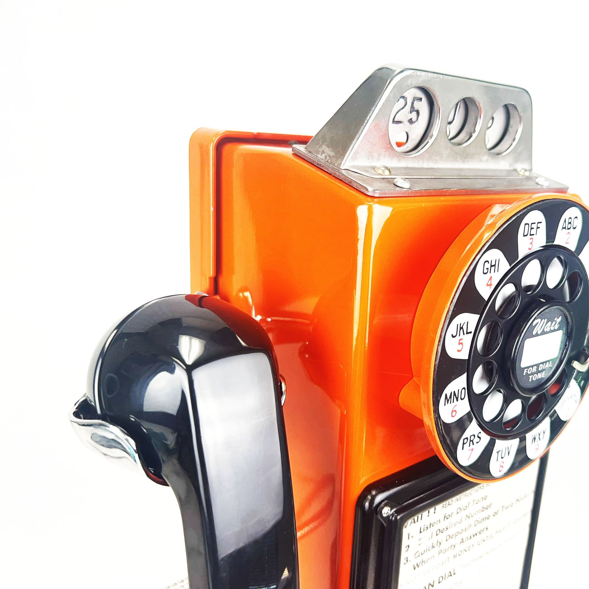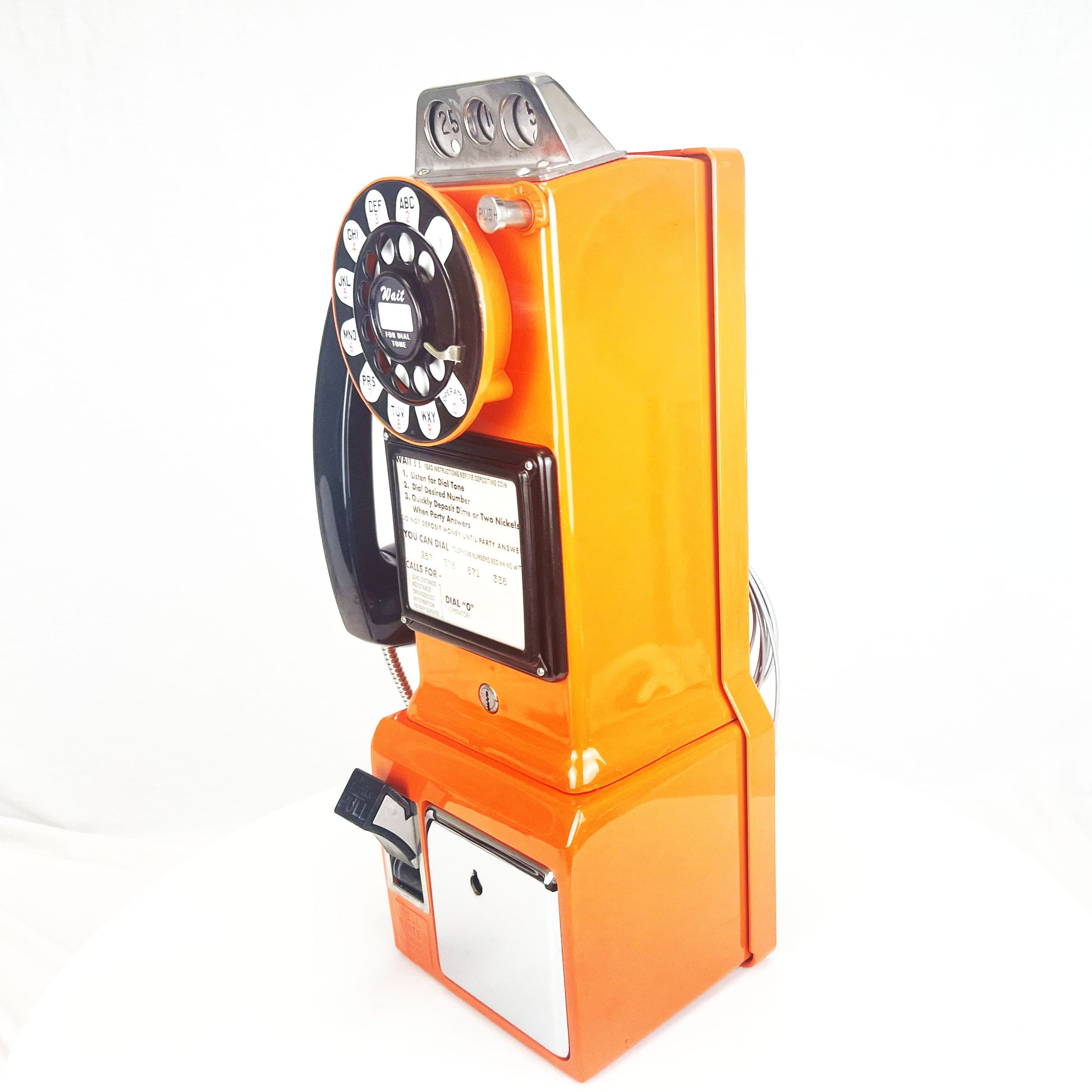 Cords – The phone has been outfitted with a brand new vinyl or optional chrome armored handset cord and a vinyl line cord. The line cord has a modular connection to facilitate a modern connection to your wall jack.